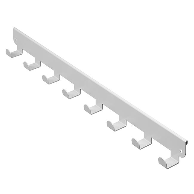 Крючки представляют собой металлическую планку с 8 крючками, которая навешивается на внешнюю боковую поверхность кронштейна в гардеробной системе ПРАКТИК HOME.